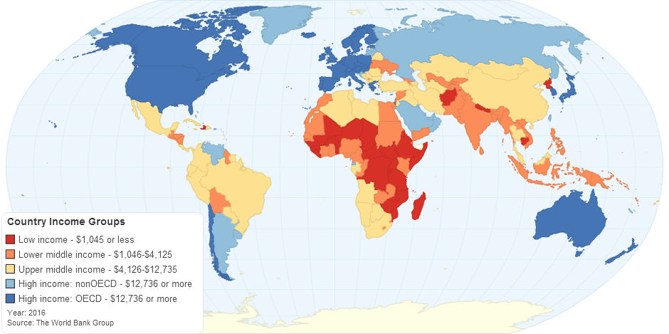 Low-income economies are defined as those with a GNI per capita, calculated using the World Bank Atlas method, of $1,025 or less in 2015; lower middle-income economies are those with a GNI per capita between $1,026 and $4,035; upper middle-income economies are those with a GNI per capita between $4,036 and $12,475; high-income economies are those with a GNI per capita of $12,476 or more.